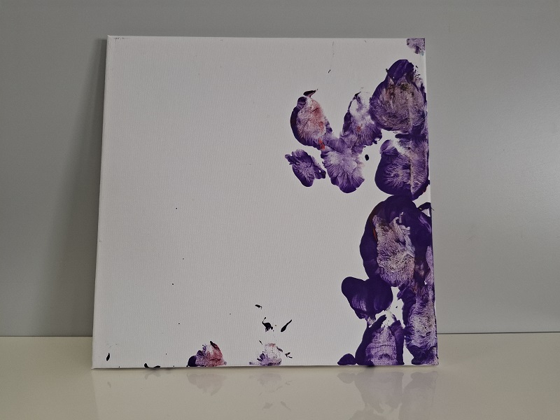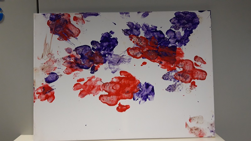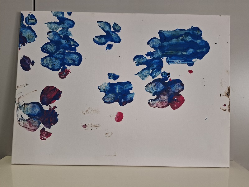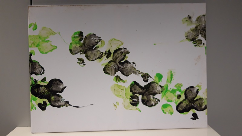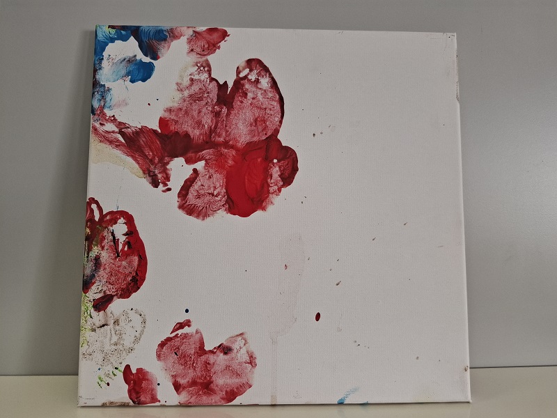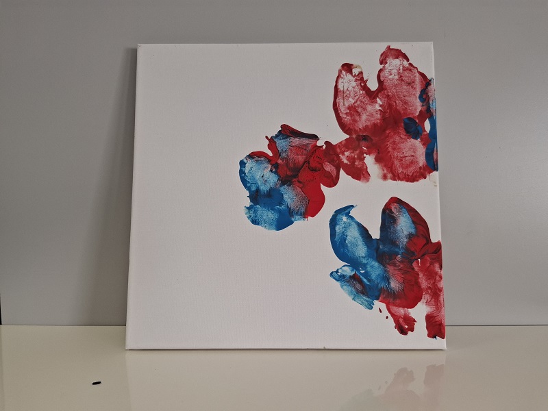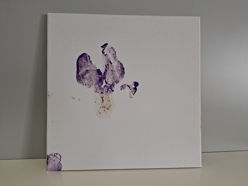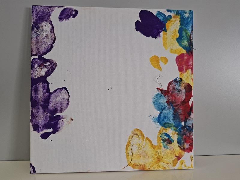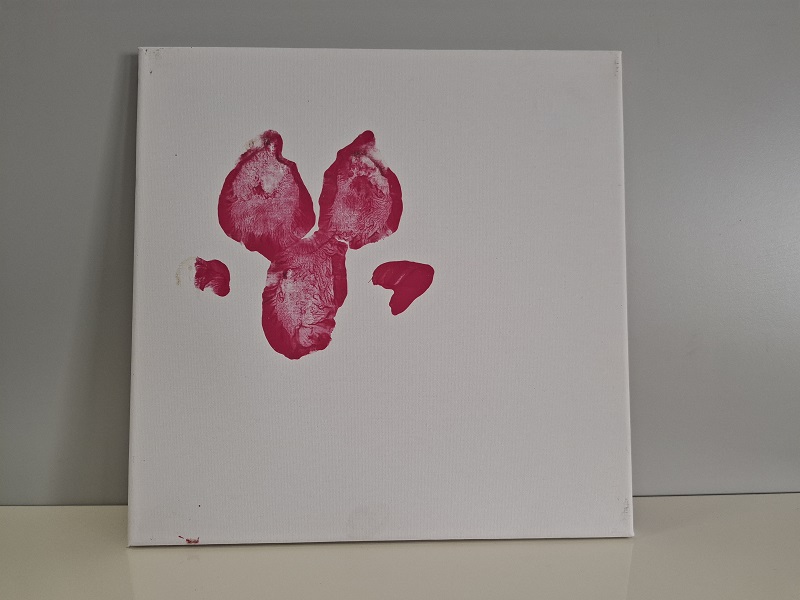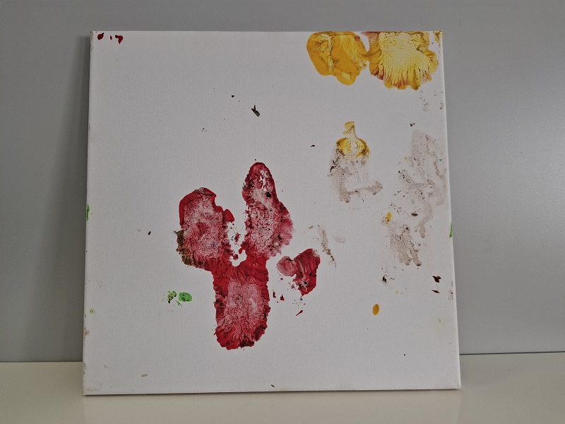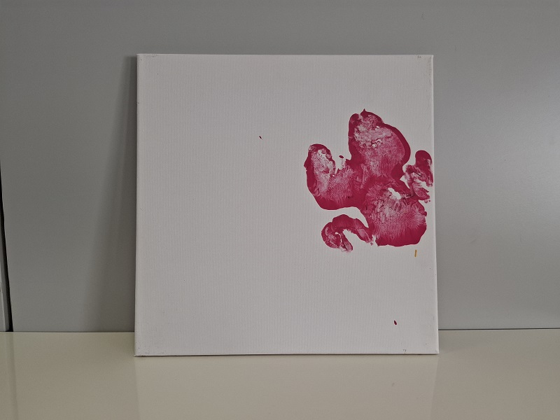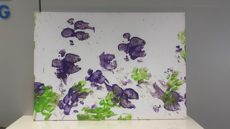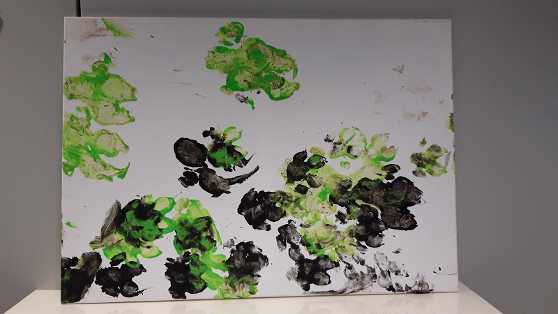 Jedes Kunstwerk der Duisburger Zwergflusspferde ist europaweit einzigartig, hat eine individuelle Nummer und wird mit Echtheitszertifikat überreicht. Den Ursprung haben die Kunstwerke im medizinischen Training. Hierbei üben die Tierpflegerinnen und Tierpfleger ungewohnte Situationen, beispielsweise das Laufen über eine Waage. Dabei nutzt das Zoo-Team gerne Attrappen. Im aktuellen Fall simulierte eine Holzplatte mit aufgesteckter Leinwand die Waage. Die verwendeten Fingerfarben stammen aus dem Malbedarf für Kinder. Sie sind dermatologisch getestet, vegan und lösen sich beim Kontakt mit Wasser sofort. In Klecksen verteilt Tierpflegerin Melina die Kinderfarbe in verschiedenen Farbtönen auf dem Boden, verstreicht sie und legt eine passende Leinwand bereit. Die Tiere laufen anschließend über den Farbteppich und verteilen die Farbe mit ihren Füßen auf der Leinwand. Manchmal schnüffeln die Flusspferde auch an den Farben und verreiben sie somit. In jedem Fall entsteht einzigartige Flusspferd-Kunst. Vor Abgabe der Kunstwerke werden die Farben durch den Zoo mit einem Fixativ-Spray fixiert, so dass die Bilder sofort aufgehangen werden können.